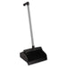 LobbyMaster Plastic Lobby Dustpan, 12w x 32h, Plastic, Black Pan/White Handle, 6/Carton. Easy-lock system keeps the handle upright and in place while you sweep. Innovative footrest pads and angled base provide stability. Large pan capacity and tapered front edge simplify dust and debris pick-up. Broom-cleaning teeth on the yoke allow you to clean your bristles as you go. Ergonomically designed "L" Grip handle. Material(s): Plastic; Width: 12"; Color(s): Black/White; Overall Length: 32 in.