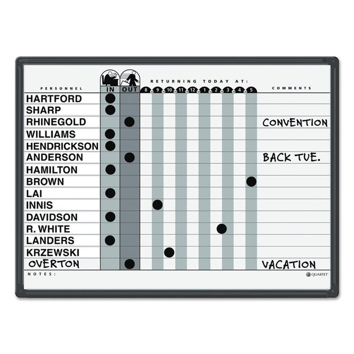 Magnetic Employee In/Out Board, Porcelain, 24 x 18, Gray/Black, Aluminum Frame. Creating and tracking a work schedule for employees is easier with a in/out board. Plan and monitor personnel status on the DuraMax® porcelain whiteboard surface. 15 Name Capacity. Board Type: Magnetic Dry Erase In/Out; Board Width: 24"; Board Height: 18"; Surface Material: DuraMax® Porcelain.