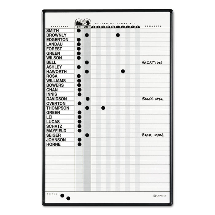 Magnetic Employee In/Out Board, Porcelain, 24 x 36, Gray/Black Aluminum Frame. Creating and tracking a work schedule for employees is easier with a in/out board. Plan and monitor personnel status on the DuraMax® porcelain whiteboard surface. 36 Name Capacity. Board Type: Magnetic Dry Erase In/Out; Board Width: 24"; Board Height: 36"; Surface Material: DuraMax® Porcelain.