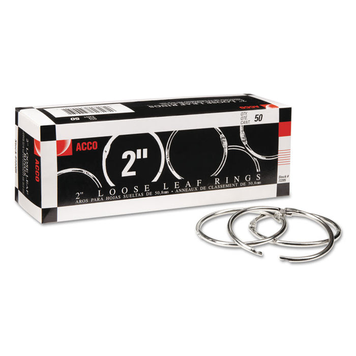 Metal Book Rings, 2" Diameter, 50/Box. Loose-leaf rings made with multi-layer nickel-plated steel will not crack or split. Rings open and close easily and lock for extra security. Ring Size: 2"; Ring Material(s): Nickel-Plated Steel.