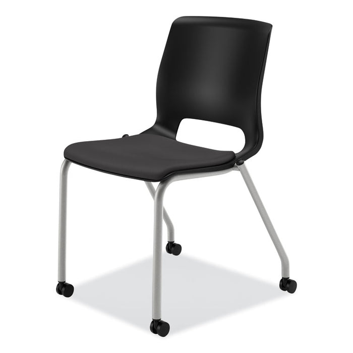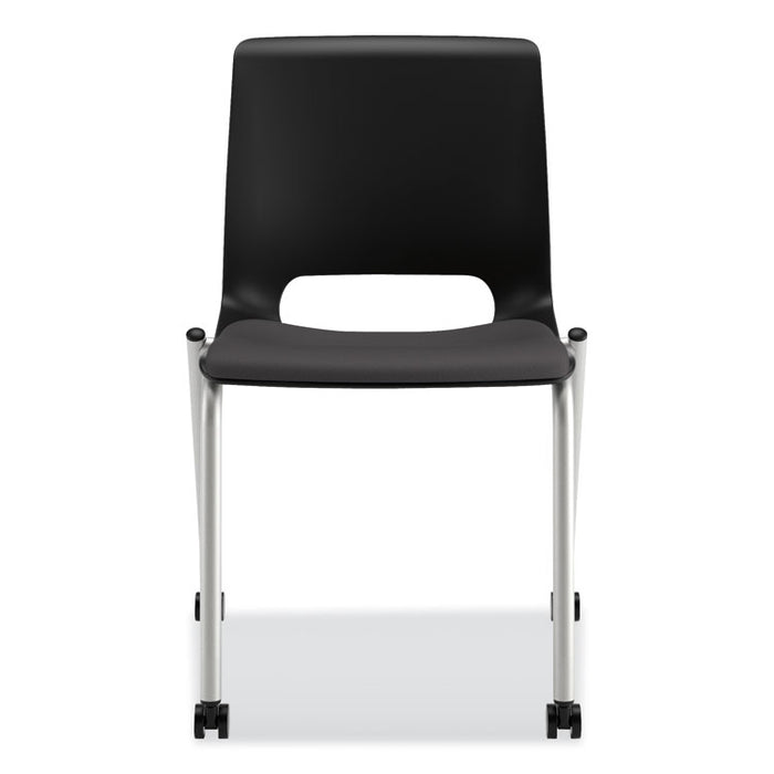 Motivate Four-Leg Stacking Chair, Supports Up to 300 lb, Onyx Seat, Black Back, Platinum Base, 2/Carton. Ideal for collaborative areas serving multiple functions, it adapts to a variety of environments to meet your changing needs. Advanced contours of the seat and back move with the body to reduce pressure points; one-piece propylene backrest can be easily wiped down. Stacks up to six high on the floor to maximize space. Recommended Applications: General Office & Task; Seat Color: Onyx; Back Color: Black; Color Family: Black.