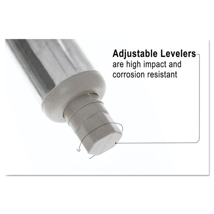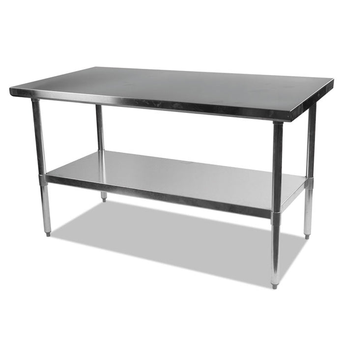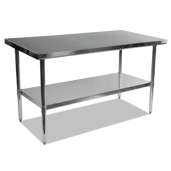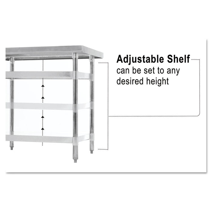 NSF Approved Stainless Steel Foodservice Prep Table, 60 x 30 x 35, Silver. A great work surface for any area. The corrosive-resistant, heat-resistant T430 top is National Sanitation Foundation approved for use with food, has a 2" rolled edge, and its surface is easy to clean, even after the dirtiest jobs. Two "C" channels under the top provide additional strength, preventing the table from sagging over time. The lower shelf is height-adjustable, giving the user the flexibility they need for a variety of tasks. 18-gauge stainless steel top; galvanized steel base and shelf. Top Color: Silver; Color Family: Silver; Base Color: Silver; Top Shape: Rectangular.