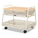 - Steel frame with wood laminate shelf and shelf with mesh baskets for storage of printers, fax machines, files or other supplies.
