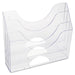 Optimizers Multifunctional Three-Pocket File Folder Organizer, 3 Sections, Letter Size Files, 13" x 3.5" x 11.5", Clear. Optimize your space with this versatile organizer: it stands upright, lays flat or mounts on the wall. Tiered pockets allow clear viewing of contents while curved design makes retrieval easy. Extra-thick plastic. Number of Compartments: 3; For File Size: Letter; Load Orientation: Top/Side; Color(s): Clear.