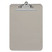 Plastic Clipboard with High Capacity Clip, 1.25" Clip Capacity, Holds 8.5 x 11 Sheets, Translucent Black. Features durable plastic construction and built-in hanging hole. Attractive transparent board material available in three popular colors. Variety of colors allows for visual identification by project or department. Holds Paper Size: 8.5 x 11; Clipboard Actual Size: 9w x 12.5h; Clipboard Material: Plastic; Clip Capacity: 1.25".