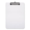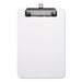 Plastic Clipboard with Low Profile Clip, 1/2" Capacity, Holds 5 x 8, Clear. Shatter-resistant plastic construction ensures durable performance in the most demanding environments. SAE and metric rulers on either edge of the clipboard provide added convenience and improved functionality. Low-profile safety clip eliminates the possibility of accidental openings, while making the clipboard easier to store in briefcases, file cabinets, laptop bags and more. Holds Paper Size: 5 x 8; Clipboard Actual Size: 6w x 9h; Clipboard Material: Plastic; Clip Capacity: 1/2".