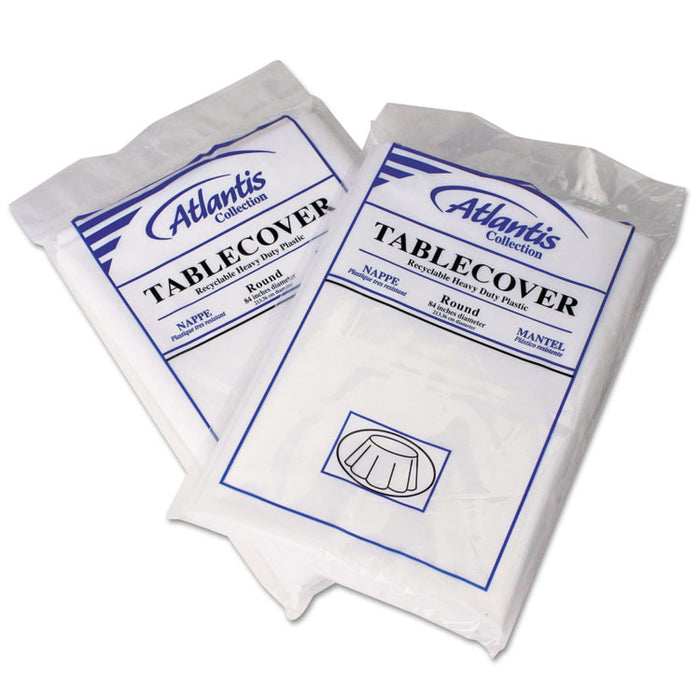 Plastic Table Cover, 84dia, White, 12/Carton. Soft, linen-like finish adds a touch of class. Durable, neat and clean. Stands up to heavy-duty use. Shape: Round; Material(s): Plastic; Color(s): White; Diameter: 84".
