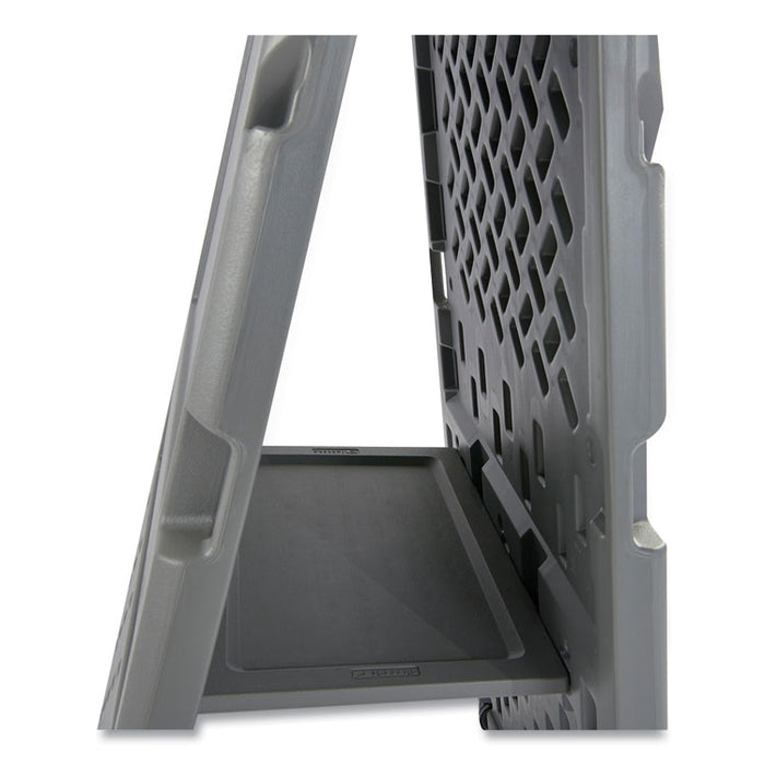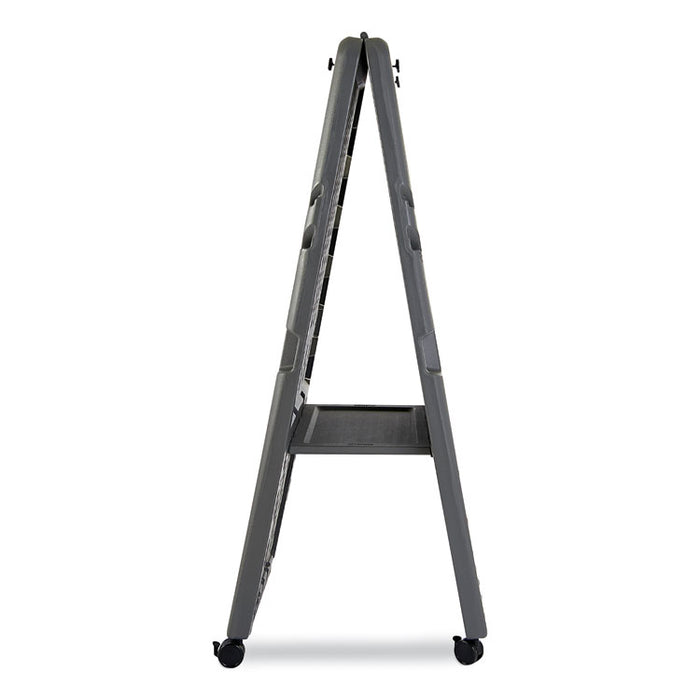 Ingenuity Presentation Flipchart Easel with Dry Erase Surface, Resin Surface Frame, 33 x 28 x 73, Charcoal. Sturdy, stylish easel is easy to transport and set up. Dual sided easel features a dry-erase writing surface and a place where 27" x 34" pads (sold separately) can be securely mounted to both sides of the board. Scratch- and dent-resistant, blow molded, high-density polyethylene construction with A-frame design provides a sturdy writing base. Includes built-in marker holder, marker tray, accessory compartment and inside storage shelf. Moving is a breeze with handles and four locking casters. Maximum easel height: 73". Presentation Flipchart Easel with Dry Erase Surface on One Side—27" x 34" dry erase surface on one side. Board Type: Dry Erase Flipchart Easel; Board Width: 33"; Board Height: 28"; Surface Material: Melamine.