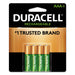 Rechargeable StayCharged NiMH Batteries, AAA, 4/Pack. Duracell® Rechargeable Precharged NiMH Batteries let you charge hundreds of times, helping you save money. With its Long-Life Ion Core technology you get amazing power in every battery. Plus, they come precharged and ready to use. They are guaranteed to last for 10 years (or 400 recharges, whichever comes first) in storage and they will hold a charge for up to 1 year when not in use. These powerful rechargeable batteries work in any NiMH charger. Battery Type: NiMH Rechargeable; Battery Size: AAA; For Use With: Everyday Electronic Devices; Battery Capacity: 800 mAh.