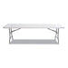 Resin Rectangular Folding Table, Square Edge, 96w x 30d x 29h, Platinum. Lightweight and durable folding table for indoor and outdoor use. Legs fold into underside cavity for safe storage and easy transport. Made with blow-molded high-density polyethylene top is dent-, scratch- and water-resistant. Banquet Tables—Holds up to 1