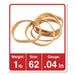 Rubber Bands, Size 62, 0.04" Gauge, Beige, 1 lb Box, 490/Pack. An excellent value, pound for pound—buy by the weight, and reap the savings associated with buying in bulk. High-rubber content, never less than 80%, ensures excellent elasticity and a high break point. Use them in the office, in your shop or in your kitchen. They even meet all FDA requirements for direct food contact. Approximate Band Count: 490; Band Trade Size: 62; Band Gauge: 0.04"; Band Width: 0.25".
