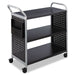Scoot Three-Shelf Utility Cart, 31w x 18d x 38h, Black/Silver. Built from pure steel, this cart features a unique hole pattern design and 3" over-sized casters (two locking). Accessible handle for easy maneuverability. Powder coat finish for durability. Rated up to 300 lbs. (100 lbs. per shelf). Color: Black/Silver; Color Family: Black; Capacity (Weight): 300 lbs (100 lbs per shelf); Caster/Glide/Wheel: Four 3" Caster (2 Locking).