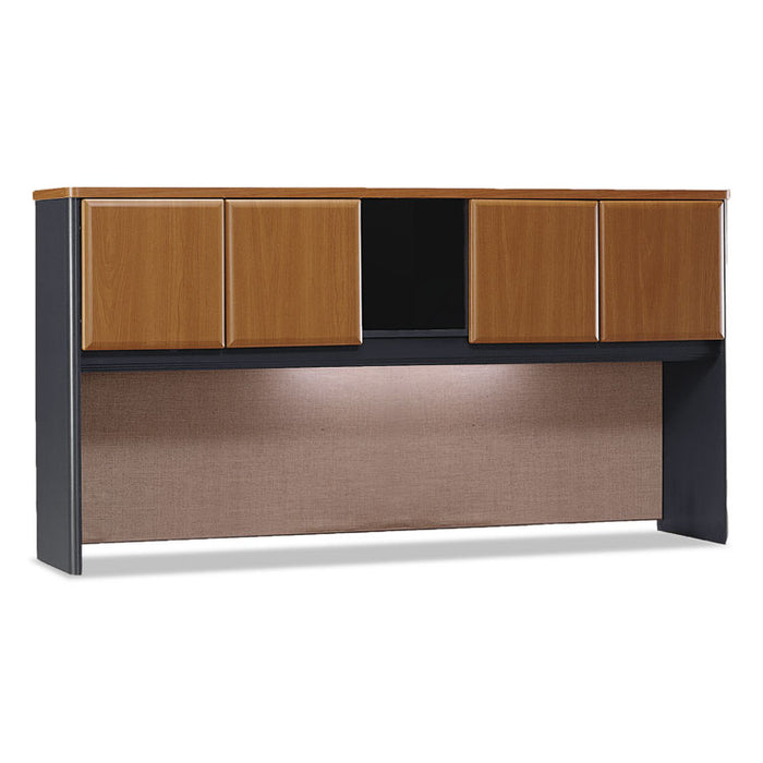 Series A Collection 72W Hutch, Natural Cherry. Series A Collection Hutch for open leg table design provides flexible solutions. This convenient Hutch clears up your desk with concealed storage. Includes two doors with self-closing, Euro-style hinges for a soft close. Mounts onto Desk or 2-Drawer Lateral File for increased storage. Accepts a Task Light (sold separately) above the fabric covered Tackboard. Keep cables hidden with integrated wire management grommets. Color: Natural Cherry; Color Family: Cherry; Overall Width: 71.63"; Overall Depth: 13.88".