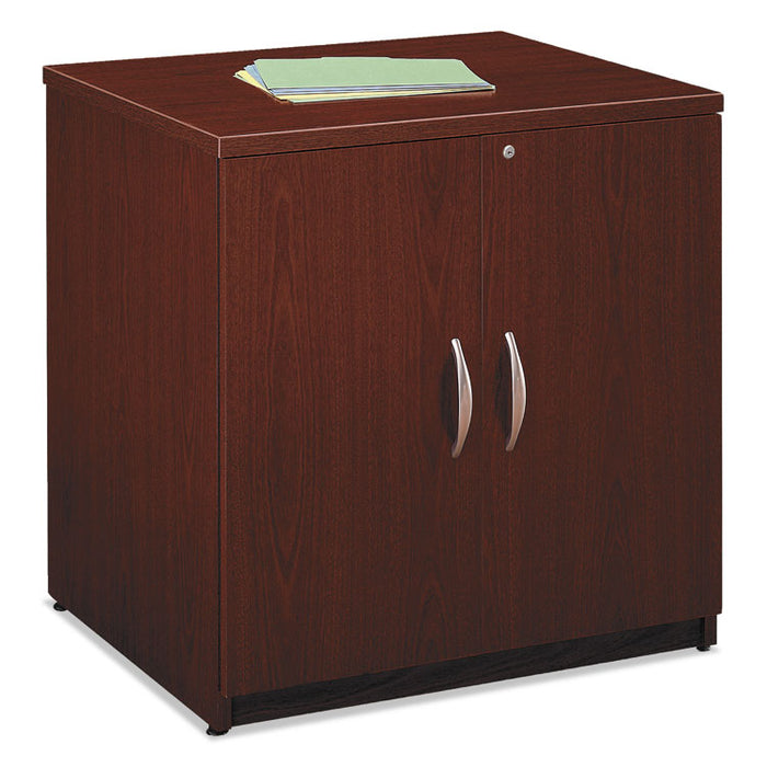 Series C Collection 30W Storage Cabinet, Mahogany. BBF Series C Collection 30W Storage Cabinet for classic styling with clean lines. Cabinet includes Euro-style, self-closing hinges and a lock to secure supplies. The interior offers ample space with an adjustable shelf to make room for electronics, printers and more. Constructed with 100% thermally fused laminate for durability and superior resistance to scratches and stains. Integrated wire management grommet located in the back panel and adjustable leveling glides help compensate for uneven floors. Combine the 30W Storage Cabinet with a 30W Hutch or place Hutch at the end of Series C desk to increase storage and function. Color: Mahogany; Overall Width: 29.5"; Overall Depth: 23.38"; Overall Height: 29.78".