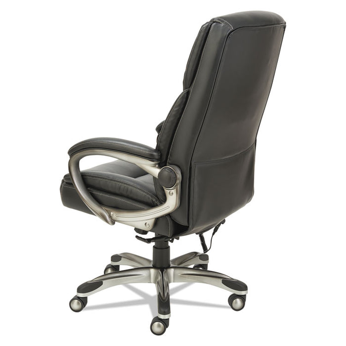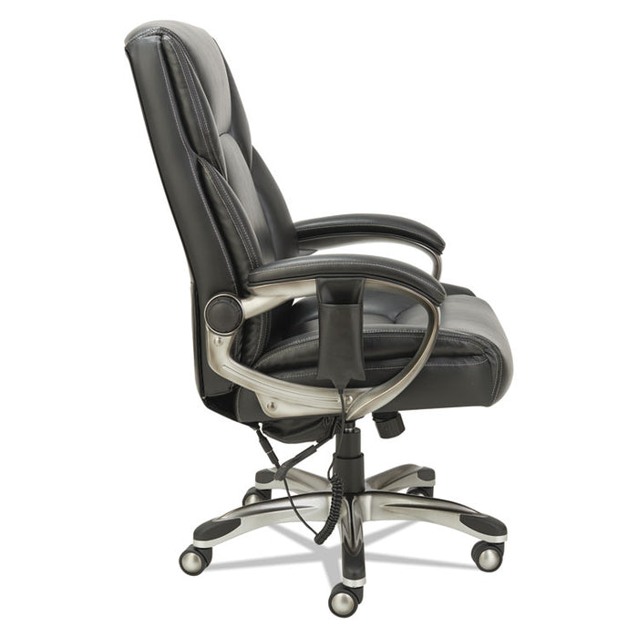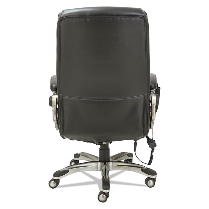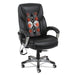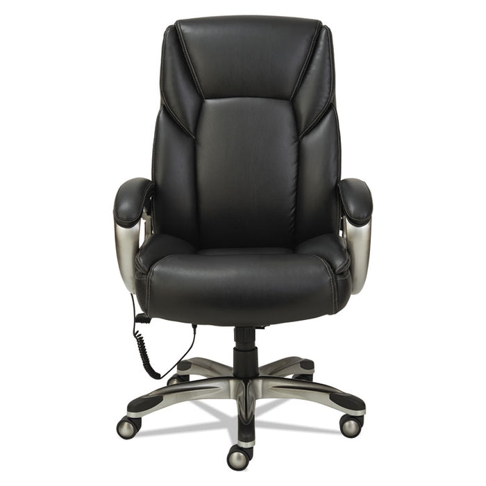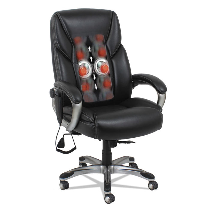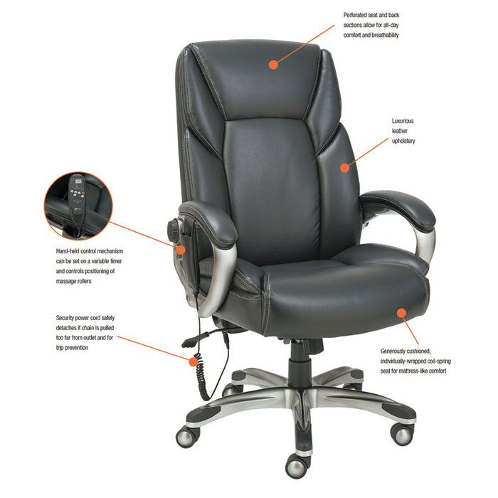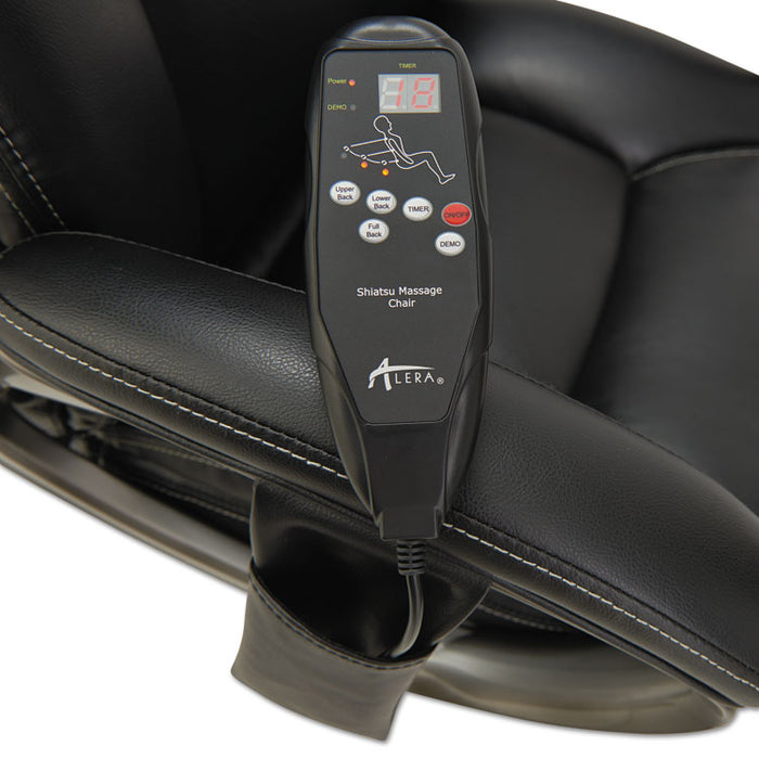 Shiatsu Massage Chair, Supports up to 275 lbs., Black Seat/Black Back, Silver Base. The seating solution to take the stress out of a busy day. Shiatsu style massage rollers move up and down along the back with perfect counter-pressure for stress relief. Moves from lumbar area to the shoulders. Hand held control mechanism can be set on a variable timer and controls positioning of massage rollers. Generously cushioned individually wrapped coil-spring seat for a mattress-like comfort. Leather chair with perforated seat and back sections allows for all-day comfort and breathability. Back locks in infinite positions to allow optimal spinal alignement and weight distribution. Wire management design allows the cords to be pulled left, right or center depending on your requirements. Security power cord safely detaches if chair pulled too far from outlet and for trip-prevention. Waterfall seat edge relives pressure on the back of the knees. Recommended Applications: Executive & Management; Seat Color: Black; Back Color: Black; Color Family: Black.The seating solution to take the stress out of a busy day.Generously cushioned individually wrapped coil-spring seat for a mattress-like comfort.Shiatsu style massage rollers move up and down along the back with perfect counter-pressure for stress relief.Hand held control mechanism can be set on a variable timer and controls positioning of massage rollers.Rollers move from lumbar area to the shoulders.Leather chair with perforated seat and back sections allows for all-day comfort and breathability.Back locks in infinite positions to allow optimal spinal alignment and weight distribution.Wire management design allows the cords to be pulled left, right or center depending on your requirements.Security power cord safely detaches if chair pulled too far from outlet and for trip-prevention.Waterfall seat edge relives pressure on the back of the knees.