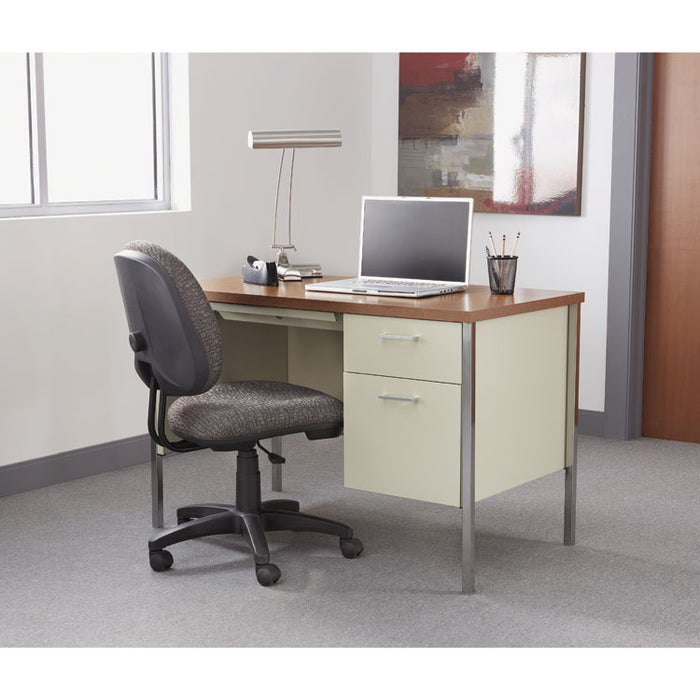Single Pedestal Steel Desk, 45.25" x 24" x 29.5", Cherry/Putty. Durable square edge laminated top is scratch- and stain-resistant. Powder coated steel frame with chrome-plated 1" square tubular steel legs. Full-extension locking file drawer with telescoping ball bearing slides accommodates hanging file folders. Box drawer with dividers operates on steel roller suspensions. Center drawer lock secures all drawers. Aluminum drawer handles. Three-quarter height modesty panel provides privacy. Leveling glides adjust for uneven floors. Color: Cherry/Putty; Color Family: Cherry; Pedestal Count: 1; Top Shape: Rectangular.
