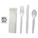 Six-Piece Cutlery Kit, Condiment/Fork/Knife/Napkin/Spoon, Heavyweight, White, 250/Carton. Why stock six items when you can have all of them in one convenient package? This kit contains a fork, spoon, knife, napkin, and salt and pepper packets, allowing you to cover all of your bases with a single, high-quality item.
