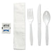 Six-Piece Cutlery Kit, Condiment/Fork/Knife/Napkin/Teaspoon, White, 250/Carton. Why stock six items when you can have all of them in one convenient package? This kit contains a fork, spoon, knife, napkin, and salt and pepper packets, allowing you to cover all of your bases with a single, high-quality item.