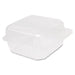StayLock Clear Hinged Lid Containers, 6.5 x 6.1 x 3, Clear, Plastic, 125/Pack, 4 Packs/Carton. Clear hinged containers offer crystal clarity for excellent product visibility. Dual bar locks ensure a secure closure, even after multiple openings, while sidewall ribbing and chamfered corners increase strength and durability. Lightweight, crush-resistant and stackable. Serve multiple applications. Food Container Type: Hinged Lid Container; Material(s): Plastic; Color(s): Clear; Width: 6 1/2".