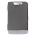Storage Clipboard with Pen Compartment, 0.5" Clip Capacity, Holds 8.5 x 11 Sheets, Black. Portable plastic-molded storage box with low-profile clipboard. Snap closure keeps documents and forms safe and secure, even on-the-go. Separate smaller compartment holds pens, clips and other small items. Corner grips help prevent snags and tears. Smooth writing surface flips open from the side. Plastic is impact- and water-resistant. Holds Paper Size: 8.5 x 11; Clipboard Actual Size: 9.75 x 14 x 1.5; Clipboard Material: Plastic; Clip Capacity: 0.5".