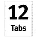 Table 'n Tabs Dividers, 12-Tab, 1 to 12, 11 x 8.5, White, 1 Set. Quick to organize, quick to reference. Economical white dividers for a variety of binder organization needs. Just print section titles on Table of Contents page that is color-coded to match pre-printed tabs. For use in standard three-ring binders. Index Divider Style: Arabic Numeric; Index Divider Size: 11 x 8.5; Punched/Unpunched: 3-Hole Punched; For Use With: Ring Binders.
