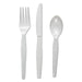 Three-Piece Cutlery Kit, Fork/Knife/Teaspoon, Heavyweight, White, 250/Carton. Serve any meal with this cutlery kit. Each pre-packaged wrapping contains a medium weight plastic fork, spoon and knife.