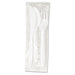 Three-Piece Cutlery Kit, Fork/Knife/Teaspoon, Polypropylene, White, 250/Carton. Serve any meal with this cutlery kit. Each pre-packaged wrapping contains a medium weight plastic fork, spoon and knife. Mediumweight.