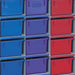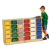 Tray Mobile Storage, 57w x 15d x 35.5h, Birch/Assorted. Cubbie holes are 8 3/4w x 14d x 5 1/2h. KYDZSafe® edges. Hardboard recessed backs. All storage units are 15" deep. KYDZTuff® finish. Caster mounted. With Colored Trays—Red, blue, yellow, green and orange. Color: Birch; Blue; Green; Red; Yellow; Overall Width: 57"; Overall Depth: 15"; Overall Height: 35.5".