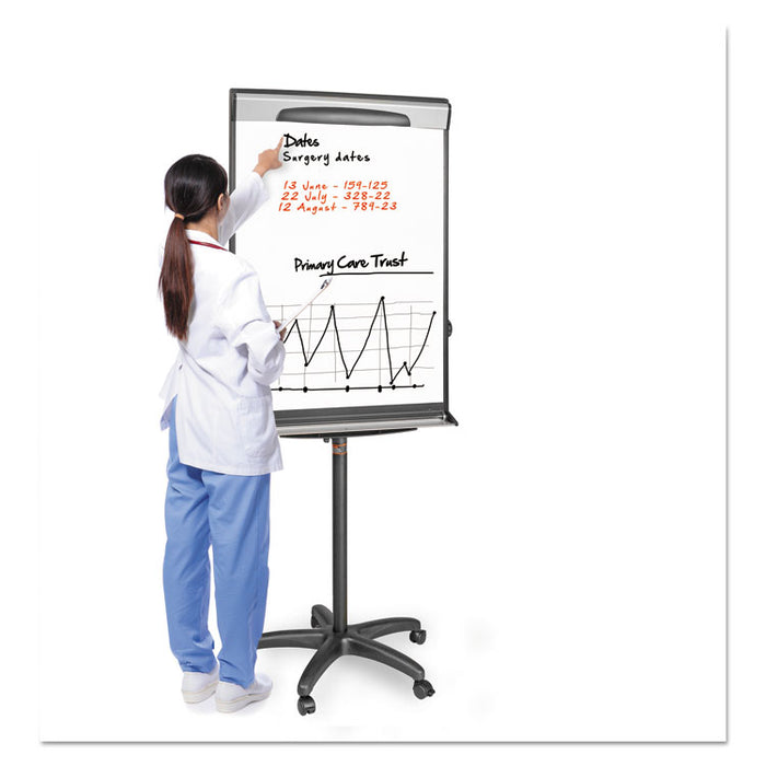 Tripod Extension Bar Magnetic Dry-Erase Easel, 69" to 78" High, Black/Silver. Use as a tabletop or floor-standing unit. Steel magnetic dry erase surface stands up to frequent use. Adjustable clips accommodate any size easel pad while two magnetic extension bars allow you to present up to three sheets of paper at a time. Folds flat for easy storage. Pen tray for writing instruments. Easel Type: Presentation; Minimum Easel Height: 69"; Maximum Easel Height: 78"; Folded Size: 42 x 30.
