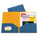 Two-Tone Two-Pocket Super Heavyweight Poly Portfolio, Letter, Blue/Orange, 6/PK. Sophisticated two-pocket folders hold presentations and proposals. Keep track of letter-size documents by organizing them in these durable portfolios. Stylish two-tone material features an eye-catching mirror finish exterior and subtle matte finish interior. Super heavyweight poly material resists tearing. Features business card slot on front inside pocket. For 8 1/2" x 11" materials. Front Cover Color(s): Steel Blue/Amber Orange; Color Family: Blue; Back Cover Color(s): Steel Blue/Amber Orange; Sheet Size: 8 1/2" x 11".