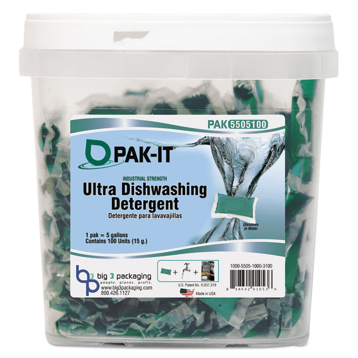Ultra Dish Detergent, Lemon Scent, 100 Paks/Tub, 4 Tubs/Carton. Cut the messy measuring out of dishwashing with handy water soluble packets with just the right amount of detergent for the job. Get a proper clean without inconvenient measuring or dangerous exposure to chemicals, and no waste due to overpouring. A highly concentrated fast-acting detergent for pots, pans, dishes and glassware. Penetrates food and heavy grease deposits while maintaining longlasting suds. Phosphate-free. pH balanced to be mild on hands. Highly concentrated formula saves storage space and reduces shipping weight. Use one pak per five gallons of water. Application: Dishwashing; Applicable Material: Cookware; Dishware; Glassware; Pots; Pans; Silverware; Utensils; Dirt Types: Dirt; Food; Grease; Scent: Lemon.