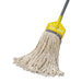Universal Headband Mop Head, Cotton, White, 32oz, 1" Blue Band, 12/Carton. The Rubbermaid Commercial Universal Headband Blend Mop is made with looped ends to reduce fraying for better performance and launderability than cut-end floor mops. Constructed of post-industrial recycled cotton content and PET recycled plastic, the universal headband fits both side-loading and clamp-style mop handles. This mop is suitable for use in commercial and industrial applications and can be laundered up to 50 times. Head Type: Wet Mop; Application: Floor Maintenance; Mop Head Style: Looped End; Mop Head Size: 32 oz.