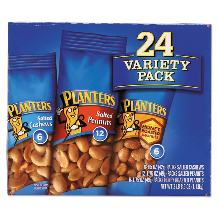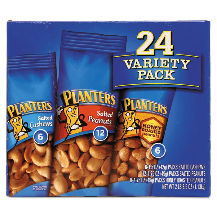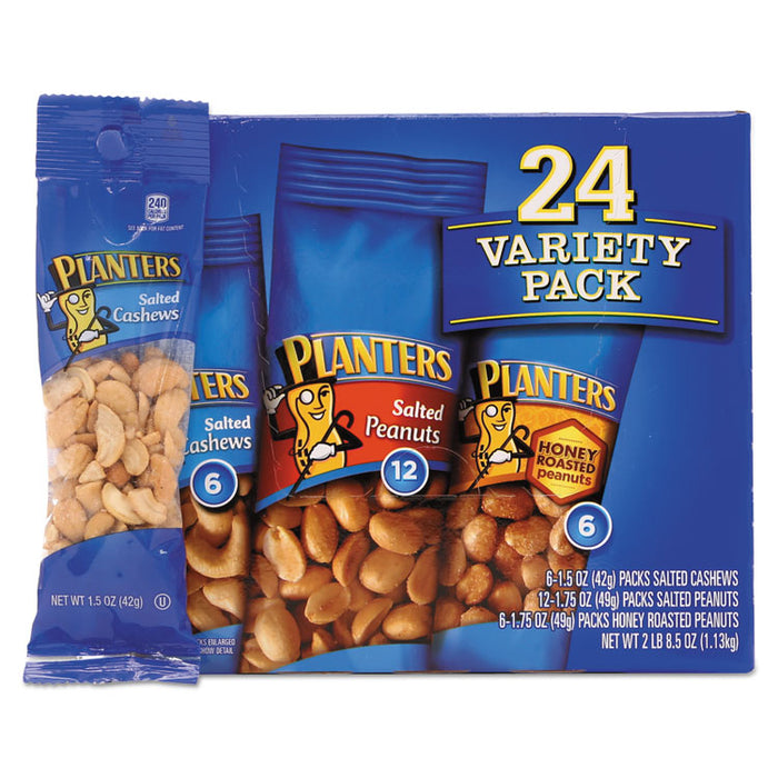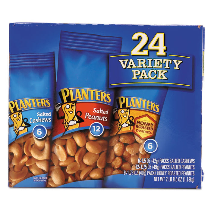 Variety Pack Peanuts and Cashews, 1.75 oz/1.5 oz Bag, 24/Box. Choose the savory, salty snack that satisfies. Peanuts and cashews are always a pleasant treat. A choice of nuts and flavors allows you to pick the one you like best. Convenient, single-serving bags help maintain freshness until it's time to enjoy. Pocket-sized packs are perfect for purses and school lunches. Includes twelve, 1.75 oz. packs of Salted Peanuts, six 1.75 oz. packs of Honey Roasted Peanuts, and six 1.5 oz. packs of Salted Cashews. Food Type: Trail Mix, Nuts & Seeds; Flavor: Salted Peanuts; Honey Roasted Peanuts; Salted Cashews; Capacity (Weight): 1.75 oz; 1.5 oz; Packing Type: Bag.