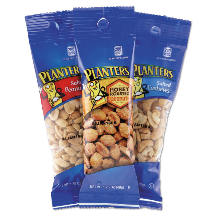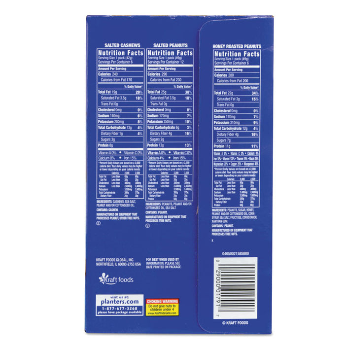 - Includes twelve, 1.75 oz. packs of Salted Peanuts, six 1.75 oz. packs of Honey Roasted Peanuts, and six 1.5 oz. packs of Salted Cashews.