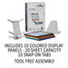 - Includes desk stand/wall adapter, 10 sleeves and 10 snap-on tabs.