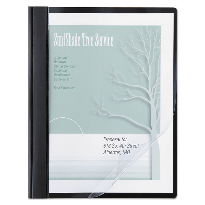 Vinyl Report Cover, Prong Clip, Ltr, 1/2"Capacity, Clear Cover/Black Back, 10/PK. Show off your title page with a transparent front cover. Report cover with colored-vinyl back is durable and water-resistant. 1/2" capacity fastener secures up to 100 letter size sheets. Front Cover Color(s): Clear; Color Family: Clear; Back Cover Color(s): Black; Sheet Size: 8 1/2 x 11.