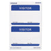 "Visitor" Self-Adhesive Name Badges, 3 1/2 x 2 1/4, White/Blue, 100/Pack. Ideal for small meetings, seminars and conferences. Badges adhere firmly and remove easily. Do not apply to leather, suede, corduroy or silk. Not for use in printers and copiers. Two name badges per sheet. Visitor. Orientation: Horizontal; Name Badge Label Length: 2.25"; Name Badge Label Width: 3.5"; Name Badge Label Color(s): White/Blue.