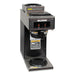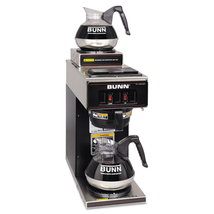VP17-2 Compact Two Burner Pourover Coffee Brewer, Stainless Steel, Black. Simple switch-control office brewer that does not require plumbing or special wiring. Just pour cold water in the top and coffee brews immediately. Features two separately controlled warmers. Low profile design fits on most countertops. Stainless steel hood and base with black accents cleans easily with a damp cloth. SplashGard® funnel deflects hot liquids away from hands. Brewing capacity: 3.8 gallons per hour. Piping hot coffee in just five minutes. Holds two 12-cup carafes. Top warmer keeps temperature at 185°F. 25 1/2" high with carafe (sold separately). 25 1/2" high w/Carafe. Number of Cups: 12; Number of Burners: 2; Warmer: Yes; Capacity (Volume): 3.8 gal.