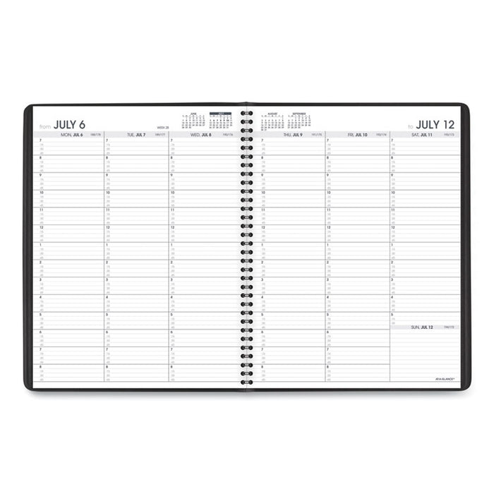 Weekly Appointment Book, 11 x 8.25, Black Cover, 14-Month (July to Aug): 2022 to 2023. Plan your week with one column per day in 15-minute intervals. Premium cover for enhanced durability with a storage pocket. High-quality paper with superior ink bleed resistance. Column-style layout for detailed planning. One week per two-page spread; past, current and two future months reference. Telephone/address pages. Size: 11 x 8.25; Page Color/Theme: White/Academic; Appointment Ruling: 15-min, 7 AM to 8:45 PM (Mon.-Fri.); 7 AM to 5:30 PM (Sat.); Open Scheduling (Sun.); Edition Year: 2020-2021.